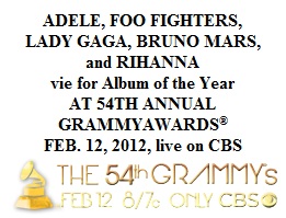 LOS ANGELES (Nov. 30, 2011)— Nominations for the 54th Annual GRAMMY Awards® (www.grammy.com) were announced tonight by The Recording Academy® and reflected an eclectic mix of the best and brightest in music over the past year, as determined by the voting members of The Academy. The 54th Annual GRAMMY Awards will be held on “GRAMMY Sunday,” Feb. 12, 2012, at STAPLES Center in Los Angeles and will be broadcast live on CBS from 8 – 11:30 p.m. (ET/PT). For updates and breaking news, please visit The Recording Academy’s social networks on Twitter and Facebook: www.twitter.com/thegrammys, www.facebook.com/thegrammys. For a complete nominations list, please visit http://www.grammy.com.