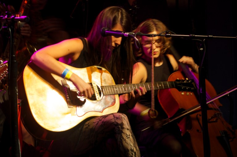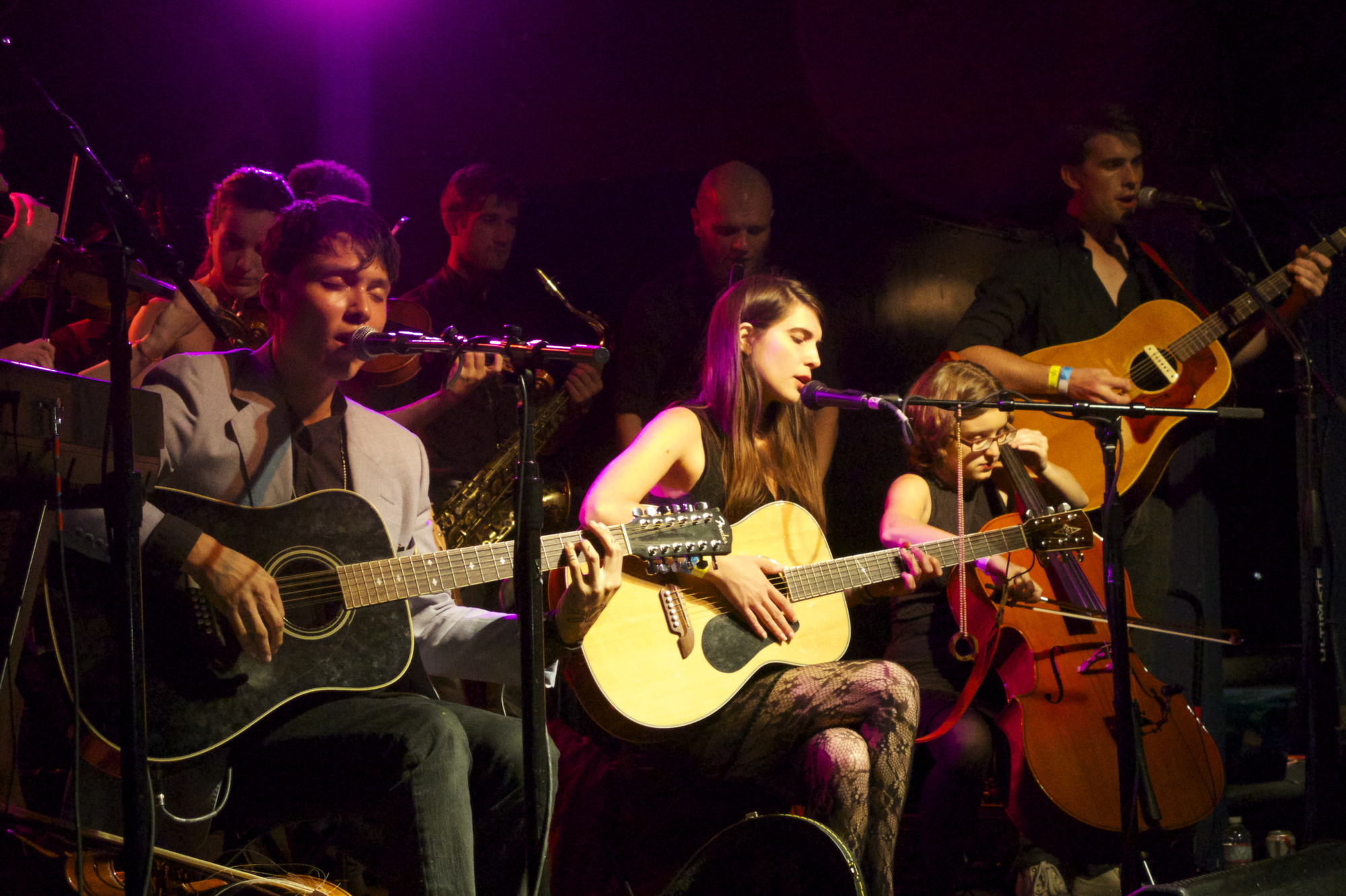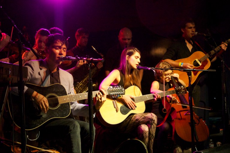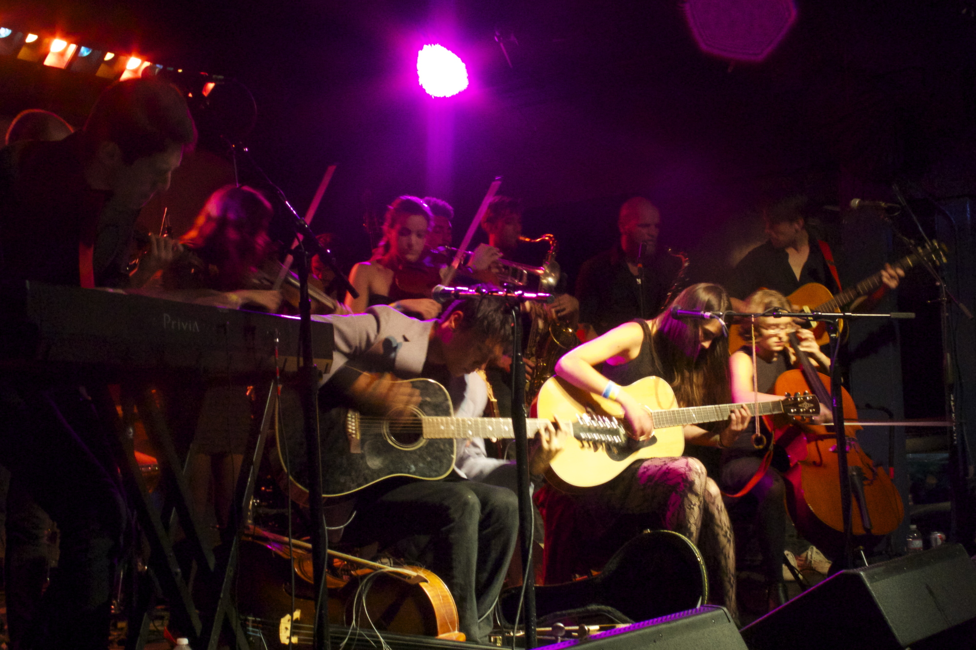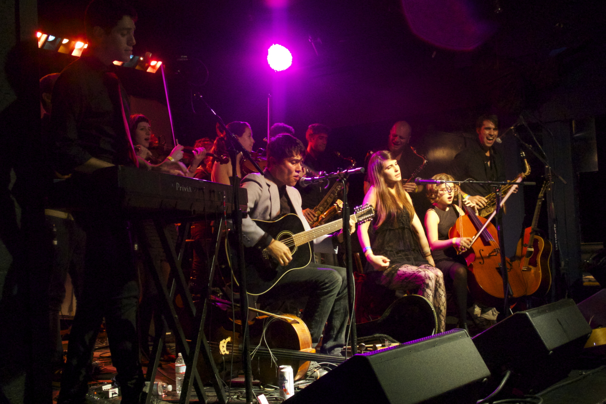 The Echo is one of LA’s great small sized music venues, allowing artists to play to an intimate crowd on a small stage under the swirling lights from a disco ball. Orchestral indie band Mother Falcon recently played at The Echo to a small crowd in a very intimate show – especially for the band members. Thirteen band members crowded onto the stage at The Echo on Tuesday night, cramming themselves and their instruments onto a stage that could barely hold them all. When you’ve got a string section, a horn section, drums, keys, guitars and an accordion, things can get pretty tight. And with all of those instruments, things can get pretty loud, too.